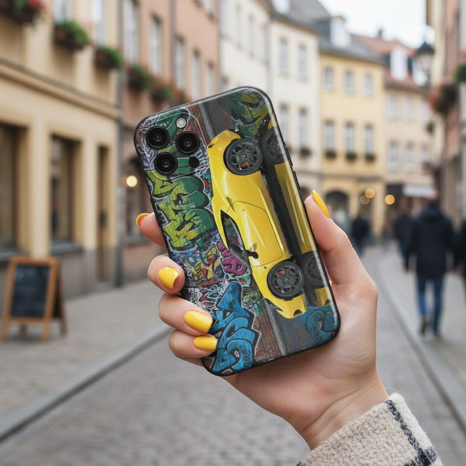 Discover our unique phone cases designed for car lovers and street art enthusiasts. Featuring a striking combination of luxury sports cars and colorful graffiti, these cases deliver a bold, stylish look that makes your phone stand out.