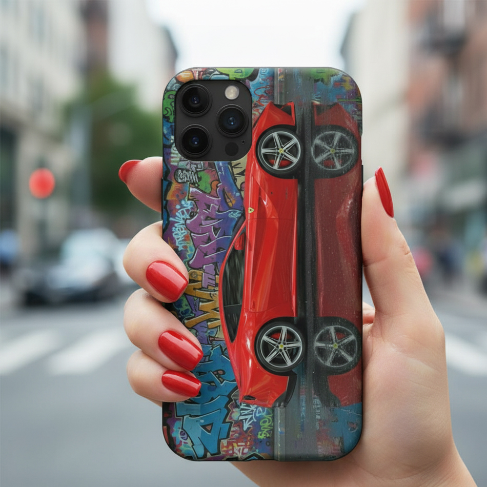Discover our unique phone cases designed for car lovers and street art enthusiasts. Featuring a striking combination of luxury sports cars and colorful graffiti, these cases deliver a bold, stylish look that makes your phone stand out.